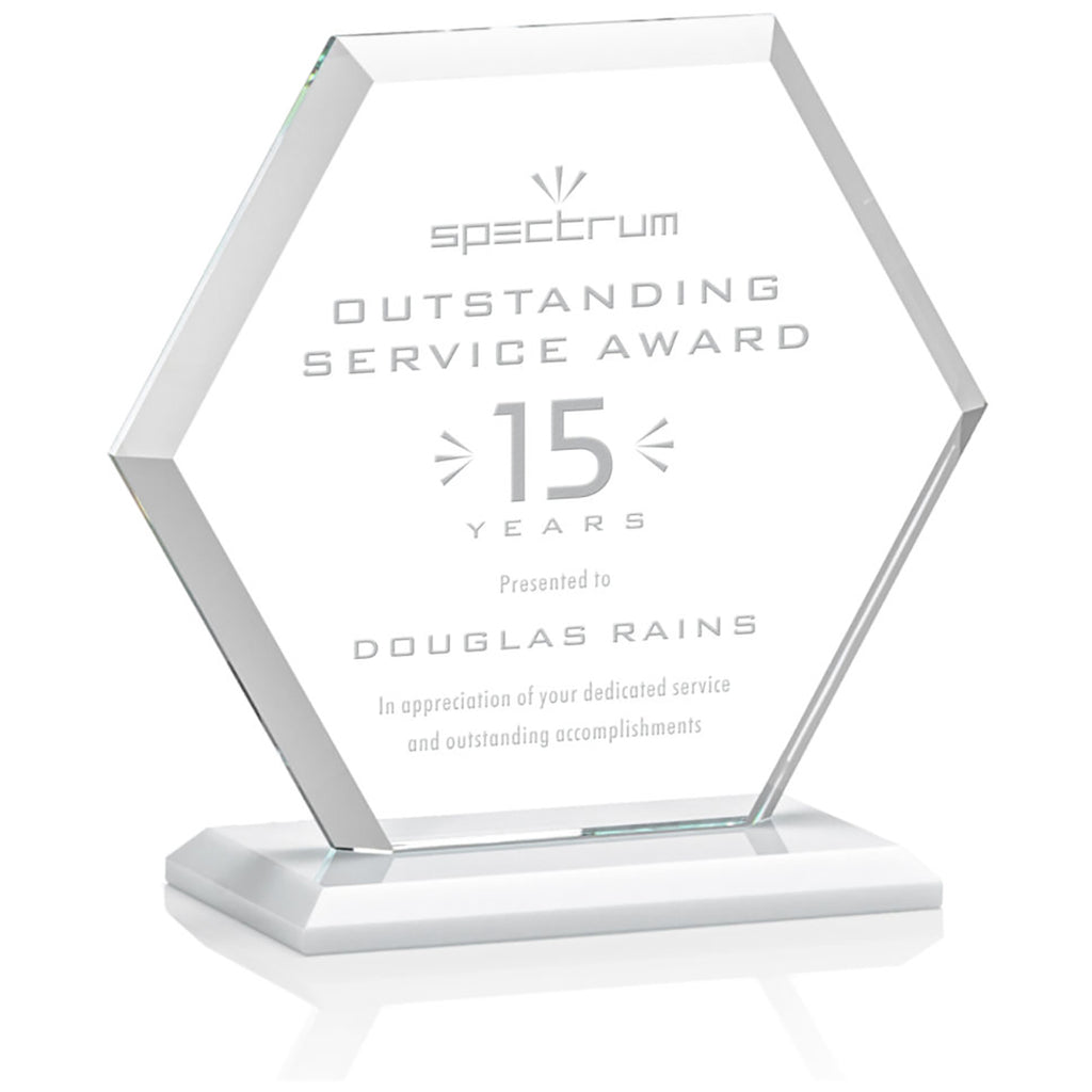 St. Regis White Barnett Award 6" x 6.25" x 3" - Laser Engraved with a custom message comes in multiple sizes to fit your special awards ceremony needs. The beveled Starfire Crystal hexagon is mounted on your choice of bases. Perfect to recognize outstanding service, anniversaries, or anything you choose. Order before your next event.