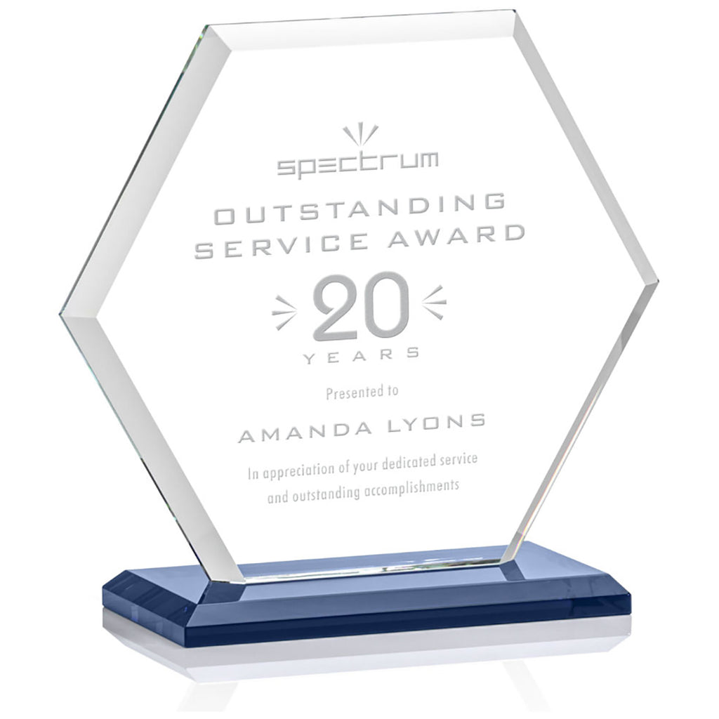 St. Regis Blue Barnett Award 7" x 7.25" x 3" - Laser Engraved with a custom message comes in multiple sizes to fit your special awards ceremony needs. The beveled Starfire Crystal hexagon is mounted on your choice of bases. Perfect to recognize outstanding service, anniversaries, or anything you choose. Order before your next event.