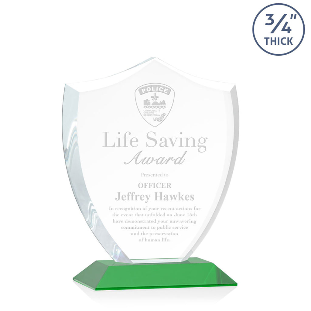 St. Regis Green Scudo Shield Award 6.25" x 7.75" x 3" with Standard Base - Laser Engraved