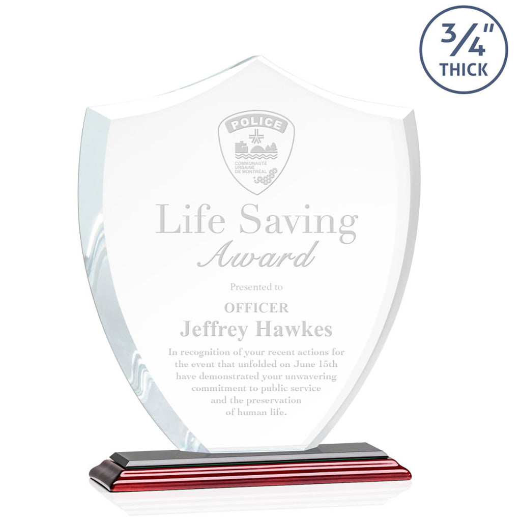 Choose your custom design for the St. Regis Rosewood Scudo Shield Award 7.25" x 8.75" x 3" with Standard Base - Laser Engraved to show appreciation to those who show excellence daily. The shield design makes these ideal for first responders, law enforcement, and others who focus on protection, authority, and stability in the community. Order early so you do not miss out.