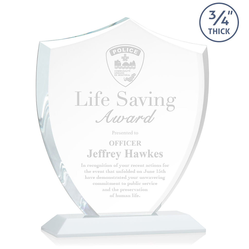 Choose your custom design for the St. Regis White Scudo Shield Award 8.125" x 9.75" x 3" with Standard Base - Laser Engraved to show appreciation to those who show excellence daily. The shield design makes these ideal for first responders, law enforcement, and others who focus on protection, authority, and stability in the community. Order early so you do not miss out.The minimum order for this product is 1 piece.