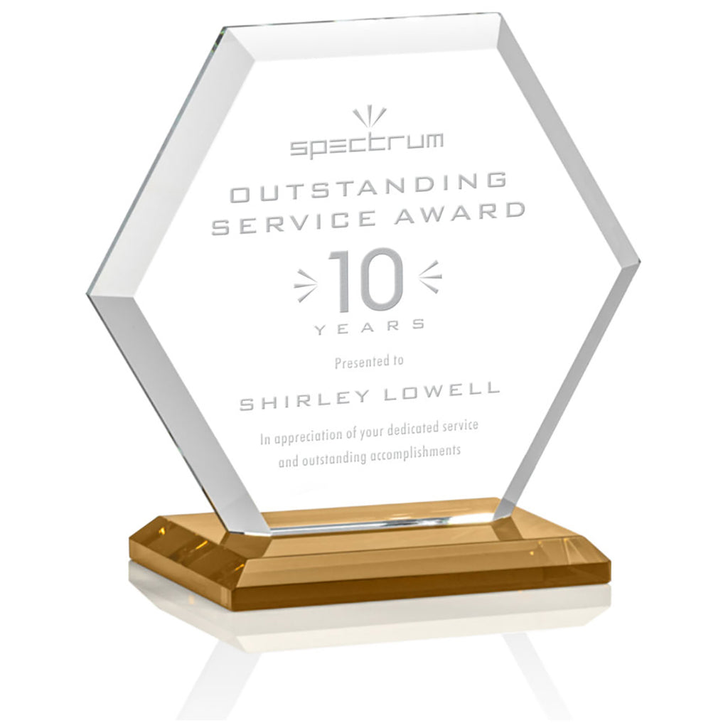St. Regis Amber Barnett Award 5" x 5.25" x 3" - Laser Engraved with a custom message comes in multiple sizes to fit your special awards ceremony needs. The beveled Starfire Crystal hexagon is mounted on your choice of bases. Perfect to recognize outstanding service, anniversaries, or anything you choose. Order before your next event.The minimum order for this product is 1 piece.