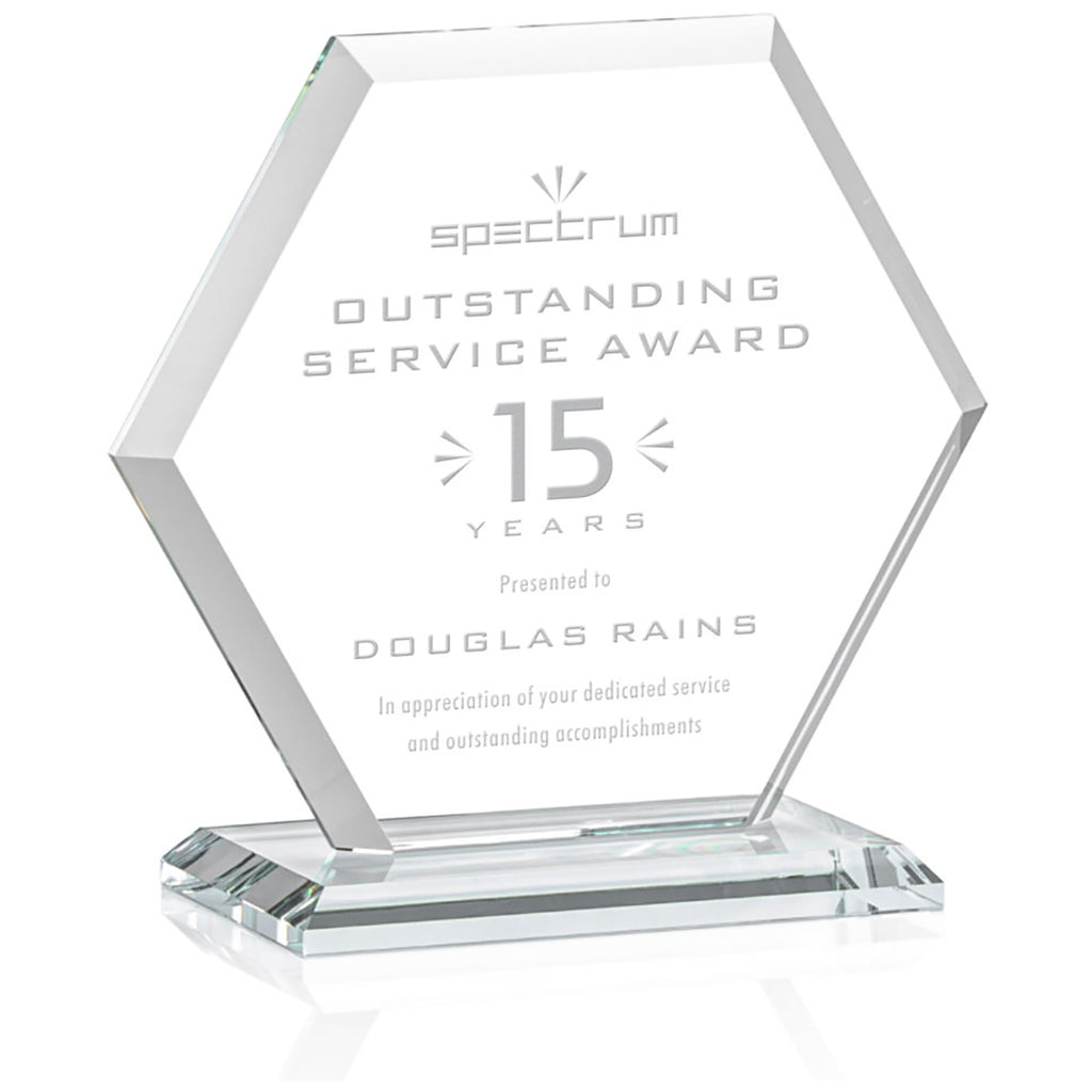 St. Regis Clear Barnett Award 6" x 6.25" x 3" - Laser Engraved with a custom message comes in multiple sizes to fit your special awards ceremony needs. The beveled Starfire Crystal hexagon is mounted on your choice of bases. Perfect to recognize outstanding service, anniversaries, or anything you choose. Order before your next event.