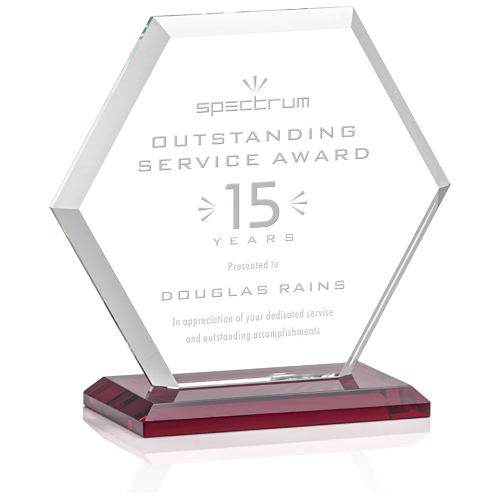 St. Regis Red Barnett Award 6" x 6.25" x 3" - Laser Engraved with a custom message comes in multiple sizes to fit your special awards ceremony needs. The beveled Starfire Crystal hexagon is mounted on your choice of bases. Perfect to recognize outstanding service, anniversaries, or anything you choose. Order before your next event.The minimum order for this product is 1 piece.