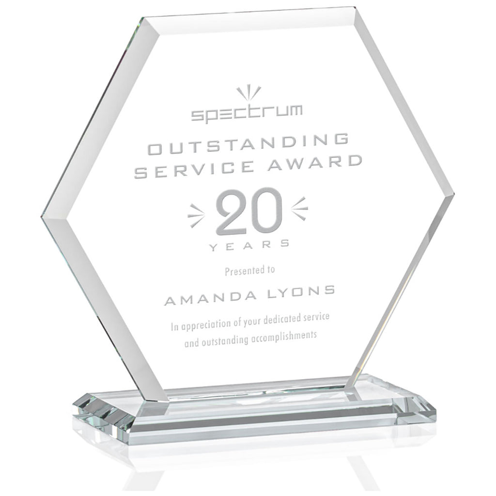St. Regis Clear Barnett Award 7" x 7.25" x 3" - Laser Engraved with a custom message comes in multiple sizes to fit your special awards ceremony needs. The beveled Starfire Crystal hexagon is mounted on your choice of bases. Perfect to recognize outstanding service, anniversaries, or anything you choose. Order before your next event.