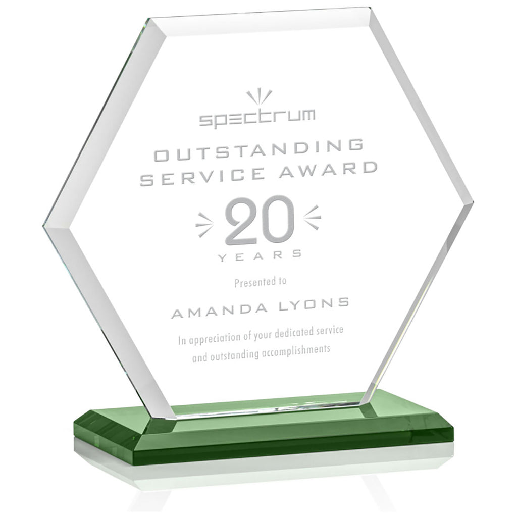 St. Regis Green Barnett Award 7" x 7.25" x 3" - Laser Engraved with a custom message comes in multiple sizes to fit your special awards ceremony needs. The beveled Starfire Crystal hexagon is mounted on your choice of bases. Perfect to recognize outstanding service, anniversaries, or anything you choose. Order before your next event.The minimum order for this product is 1 piece.