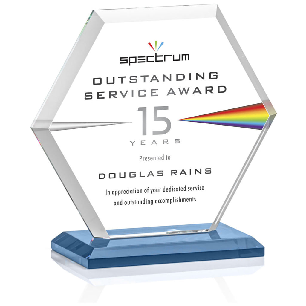 St. Regis Light Blue Barnett Award 6" x 6.25" x 3" - Printed with a custom message comes in multiple sizes to fit your special awards ceremony needs. The beveled Starfire Crystal hexagon is mounted on your choice of bases. Perfect to recognize outstanding service, anniversaries, or anything you choose. Order before your next event.The minimum order for this product is 1 piece.