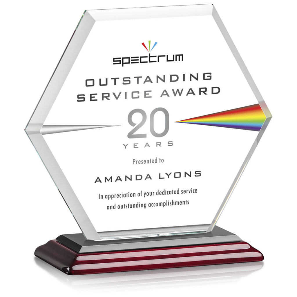 St. Regis Rosewood Barnett Award 7" x 7.25" x 3" - Printed with a custom message comes in multiple sizes to fit your special awards ceremony needs. The beveled Starfire Crystal hexagon is mounted on your choice of bases. Perfect to recognize outstanding service, anniversaries, or anything you choose. Order before your next event.The minimum order for this product is 1 piece.