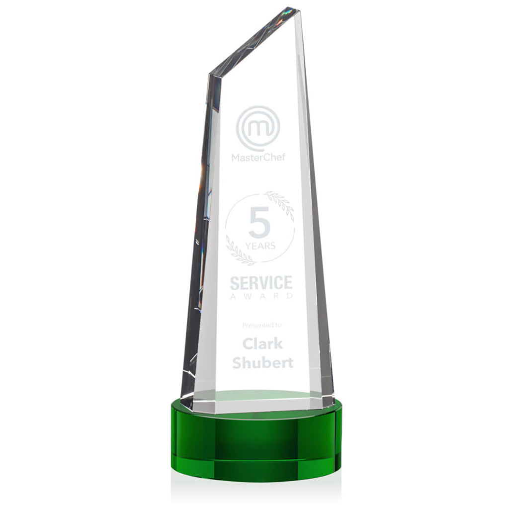 Create a custom message for the St. Regis Green Akron Tower Award 3.5" x 9.125" x 3.5" with Base - Laser Engraved to give an award that is as special as the recipient. This trapezoidal tower is anchored with a thick optical crystal bottom that tapers to a peak to create an eye-catching design. Perfect for companies, services awards, or sporting championships.