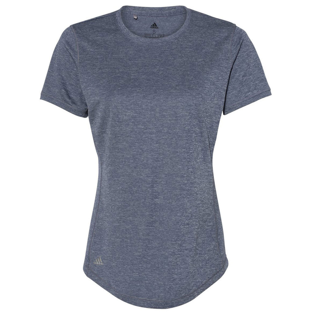 Hit the gym in a custom screen print Adidas Women's Collegiate Navy Heather Sport T-Shirt. Made of 100% recycled polyester pique, this tee is good for the environment and your growing wardrobe. Add a custom logo to this crewneck sport shirt to use for team events or even employee apparel. The hydrophilic finish with UPF 50+ protection means this t-shirt can be worn outdoors all day and still remain comfortable, A curved hem offers extra coverage whether lifting weights or playing outdoors with the kids. Place an order today for these tees with a company logo to use as employee gifts that will be appreciated throughout the year.