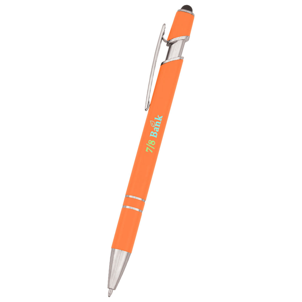 Hit Orange Roslin Incline Stylus Pen with your custom logo is a simple and economical way to share your brand or message. Available in a range of colors, this stylus pen is clickable and has smooth writing. You can easily take notes and then flip it around to use the stylus on your iPad or screen. Great for the office, home, or anywhere you need to be productive.