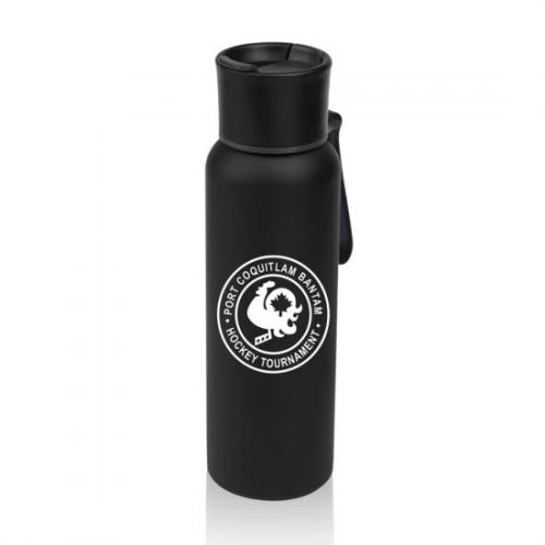 This K & R Black The Hurdler stainless steel water bottle was designed with the modern athlete in mind. Ensure everyone at the gym spots your custom logo by adding it to this bottle's matte black exterior. With an ice cube friendly opening, the color contrasting lid and silicone carry handle add the perfect design elements to this practical accessory.The minimum order for this product is 35 pieces.