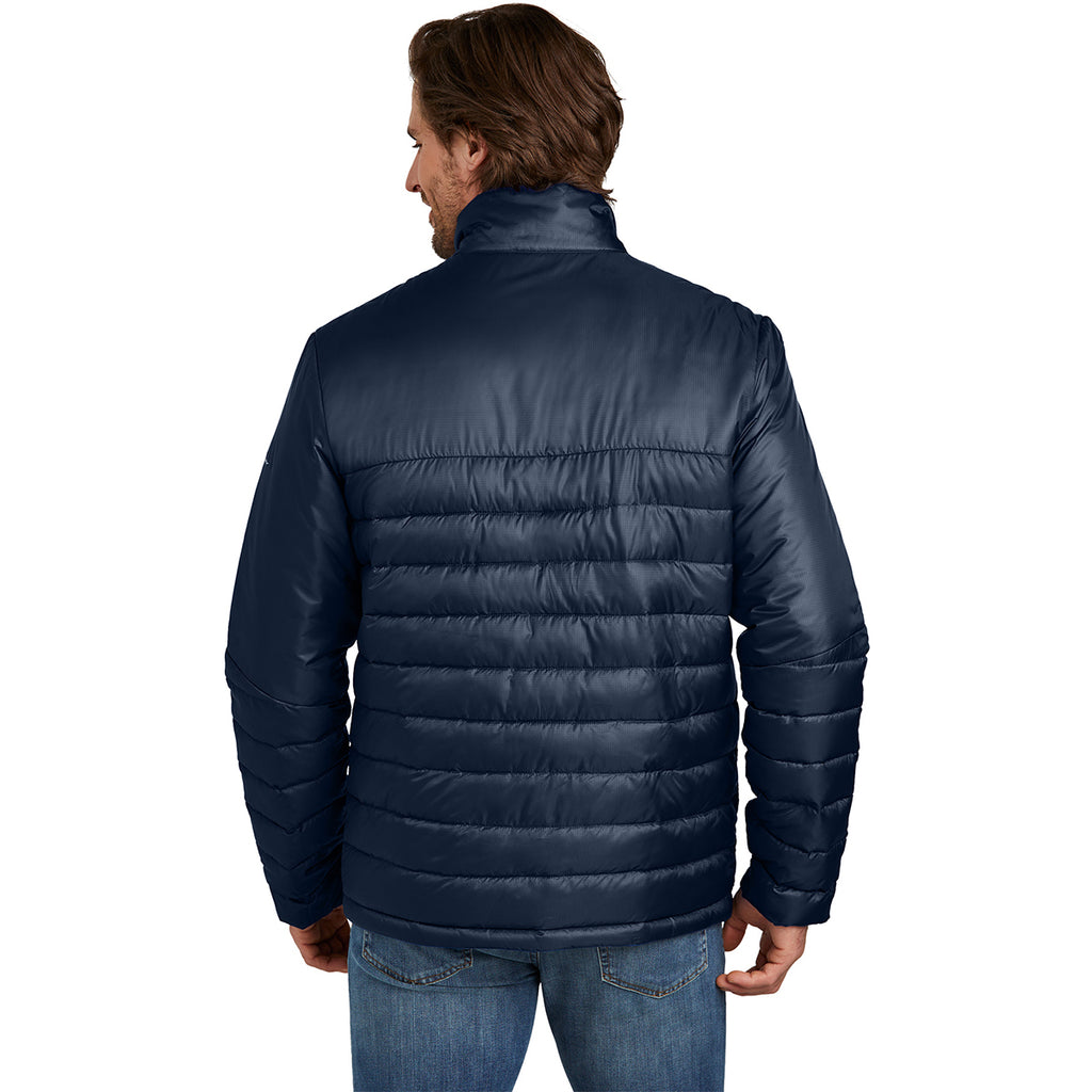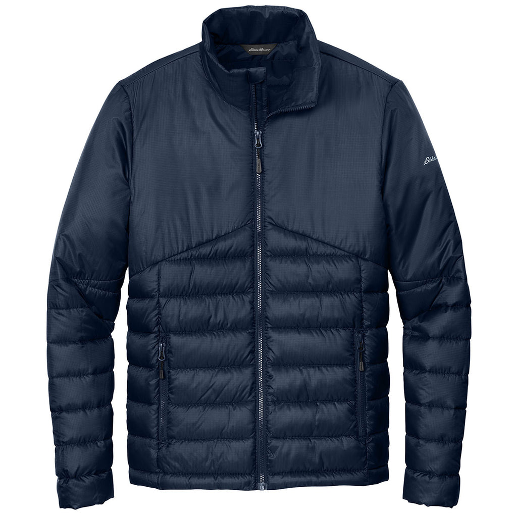 Eddie Bauer Men's River Blue Navy Quilted Jacket with a custom logo is ideal for those who work or play in the Great Outdoors. The quilted jacket is warm without being bulky and maximized to keep you warm while building snowmen, hitting a black diamond slope, or watching an outdoor game with friends. Place an order today.This product can only ship within the United States, Puerto Rico, Canada, and Mexico.