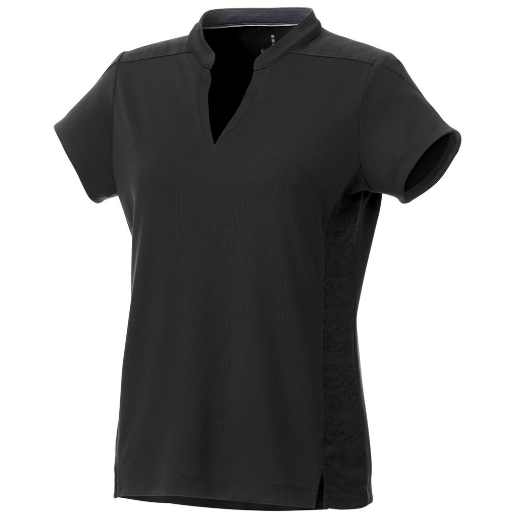 Add a custom logo to the Elevate Women's Black Piedmont Short Sleeve Polo that has a subtle graphic and reflective details. This stylish polo offers a hidden button placket, shaped seams, a tapered waist, and sleek stand collar for a silhouette that any woman can love. Don't let the details fool you, this polo also offers moisture-wicking, snag-resistance, UPF 40+, and wash and wear performance which makes it perfect as employee apparel or employee gifts when a company logo is added. The polyester double knit birdseye mesh knit will stand up to many days of work and play.Corresponding Men's Style:Elevate Men's Black Piedmont Short Sleeve Polo