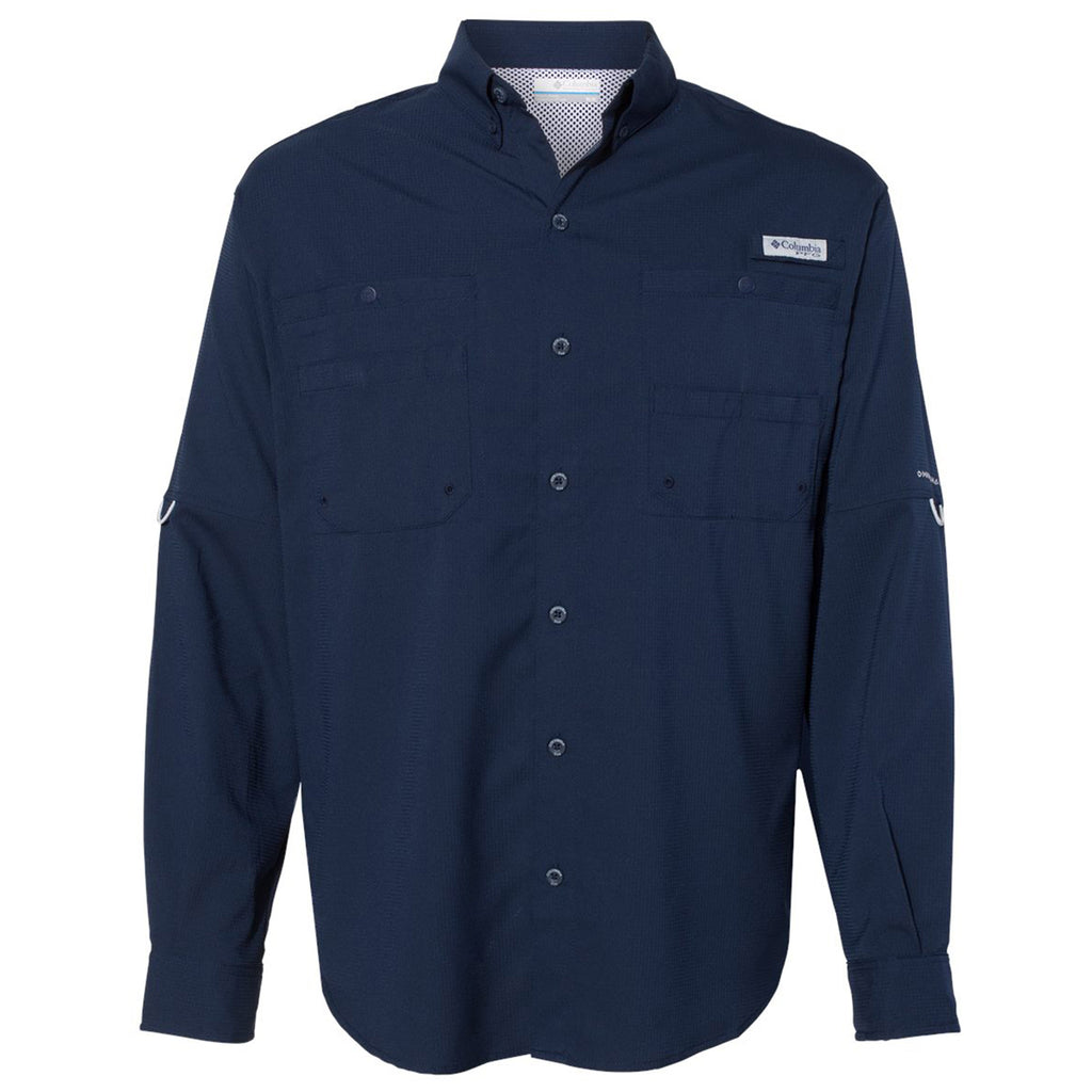 Create a corporate logo for the Columbia Men's Collegiate Navy PFG Tamiami Long Sleeve Shirt. This all-around polyester ripstop shirt offers Omni-SHADE UPF 40 sun protection, Omni-WICK quick dry, and roll-up sleeves to wear year-round as you work your hardest or enjoy the Great Outdoors using the built-in rod holder.This product cannot ship outside of the United States.