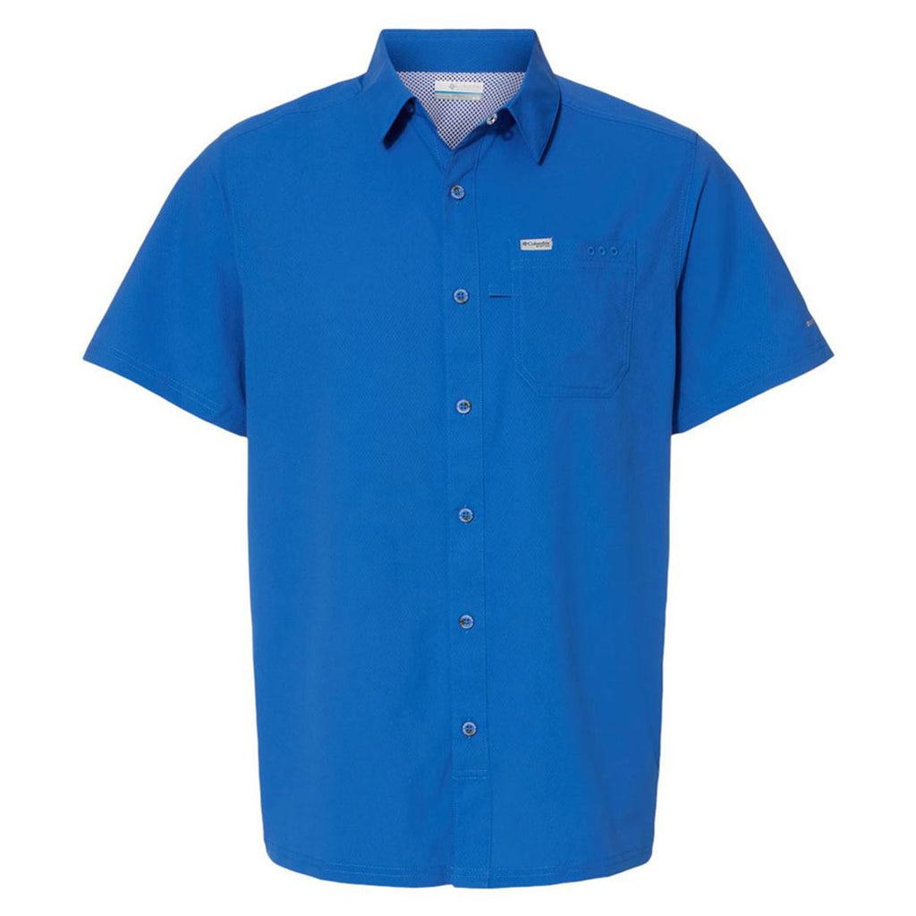 Relax and unwind in a custom Columbia Men's Vivid Blue Slack Tide Camp Shirt with Omni-Shade UPF 50 sun protection and Omni-Wick technology. This short sleeve button-up is vented and has a sunglass cleaning patch for convenience as you enjoy the great outdoors. Add a company logo to use this highly functional shirt as employee apparel or a custom logo to create team or organizational gear that most will appreciate. The ease and comfort of this camp shirt makes you want to relax, unwind, and enjoy the outdoors.