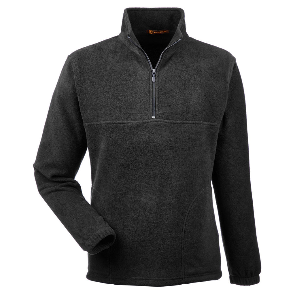Highly breathable medium weight fleece makes the Harriton Men's Black 8 oz. Quarter-Zip Fleece Pullover a must have for your corporate apparel collection. The non-pill finish on the surface ensures the tightly woven fabric never unravels. Non-roll elastic cuffs allow you to move your arms freely to increase productivity during outdoor work projects. On the seam pockets offer you storage space for electronic devices, such as an iPod and Smartphone. The stylish front yoke and dyed-to-match zippers will attract the interest of potential customers. Attach a custom logo that lets potential customers know about your company.Highlights
