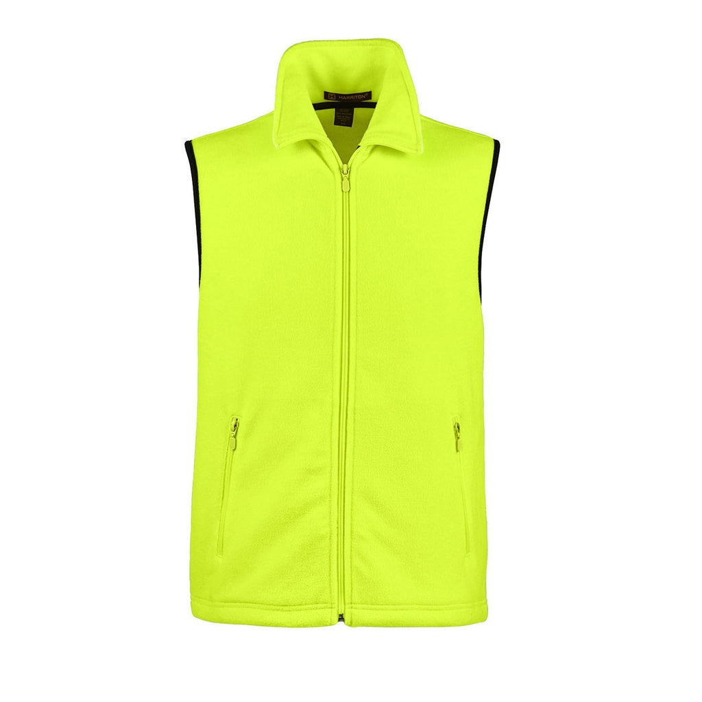 Crafted from 100% polyester fleece and treated with a non-pill finish, Harriton Men's Safety Yellow 8 oz. Fleece Vest is simply a go-anywhere vest that locks in warmth close to your core and lets your arms move freely. It's a great everyday layering piece and even extends to dress you up for special fall rituals. Features include matching zippers, bottom hem with drawcord, binding on armholes, front pocket, back yoke, stand-up collar for wind protection and a front full-zip closure. Build trust with your brand to win strategic advantage over your rivals by customizing this men's fleece vest with your company's logo.Highlights