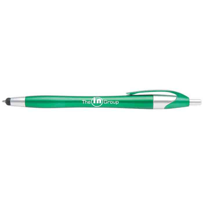 Durable metal protects the ink cartridge from damage caused by frequent drops from office desks and tables. The metal construction of the Hub Pens Green Javalina Metallic Stylus pen also generates a sleek appearance that will turn heads at corporate events. Take advantage of the head turning by attaching your corporate logo to the barrel. The ideal promotional gift contains a brushed satin finish and silver accents that create an executive appearance for the pen. Use the soft stylus to write messages on electronic devices such as an iPad or mobile tablet, without having to worry about scratching the sensitive touchscreen surface.