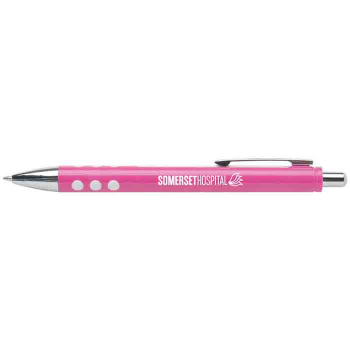 Easy to operate push retractable action makes the Hub Pens Pink Hulo Pen writing instrument a must have addition to your office supply inventory. Durable plastic covers the retractable pen to prevent damage caused by strong impacts that result from frequent mishandling of the writing device. Enjoy even distribution of solid ink that never runs into other part of your notes. Bright colors and a glossy finish complement the silver accents. Sleek lines added for high end business accessory appeal do not create an expensive pen your company cannot afford. Add your corporate logo to complete the design deal.