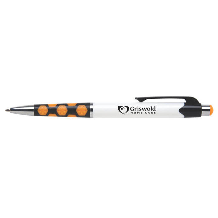 Hub Pen typically creates a large, imprint area on its selection of Hub Pens Orange Mardi Gras Hex Pen to produce the ultimate promotional gift for savvy marketers. Simply attach a custom logo on the large imprint area and enjoy increased awareness of your company during weeklong business trips. Dependable push retractable action always delivers the rugged tip that applies even coats of ink on paper and other writing surfaces. As the most colorful addition to the Hub Pen inventory, you can expect to enjoy ultra-smooth writing for all business occasions. Logoed corporate gifts offer you an affordable way to generate buzz for your products and services.