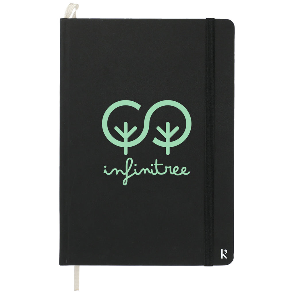 Karst Black Stone Bound Notebook "5.5 x 8.5" with logoed screen print is the perfect addition to every employee welcome package. This notebook is designed for the most creative among us with a water-resistant hard cover, 72 sheets of white stone lined pages, a ribbon page marker, and a back document pocket. Add a custom logo to the front cover to use at trade shows or as an event giveaway for a contest or fundraising program. Once used, the notebook is recyclable if needed, but this will be a way people save thoughts and ideas that inspire. Place an order today for this versatile notebook.