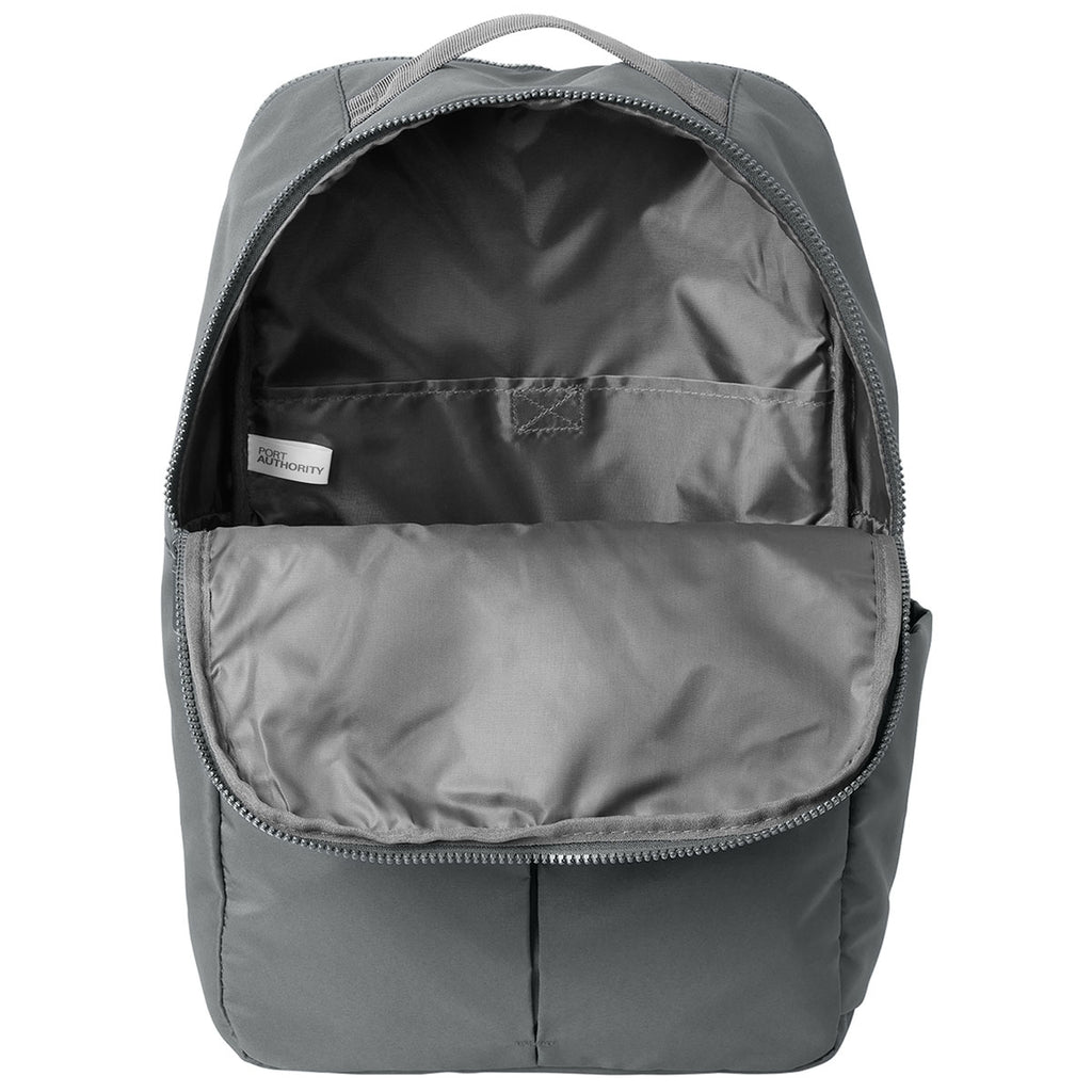 Streamline your look with a custom embroidered Port Authority Storm Grey Matte Backpack. The smooth matte polyester knitted cloth backpack has a zippered main compartment, side pocket, and laptop sleeve for convenience. Keep organized as you commute to work, school, or an overnight trip. Place an order right away.Highlights