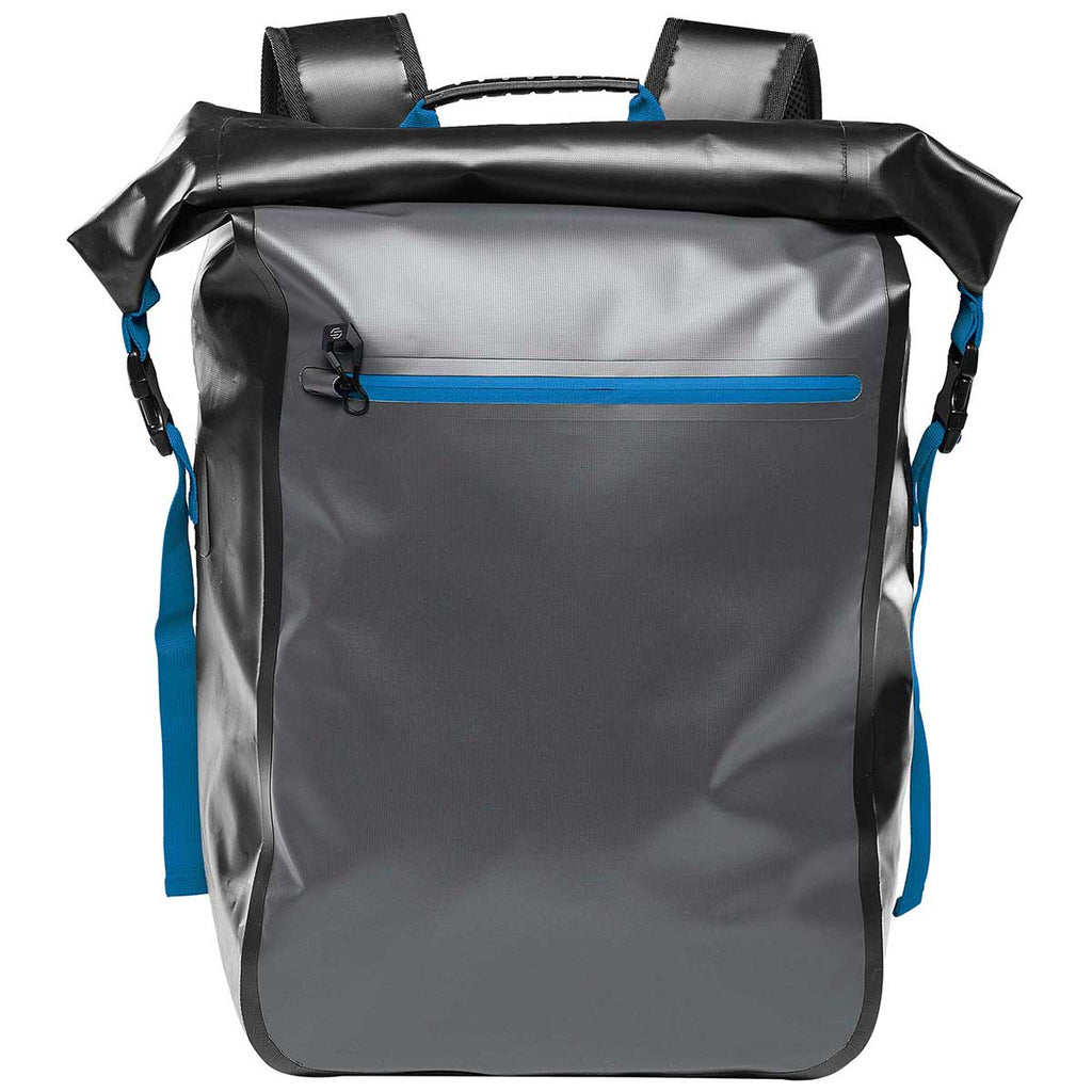 Add embroidery to the Stormtech Black/Graphite/Azure Blue Kemano Backpack to start the season right. This vibrant backpack screams to be enjoyed in the great outdoors whether used as part of workwear or offered as a corporate gift to be enjoyed on personal time. Made tough for whatever you need, the ventilated back panel is breathable for the hottest of days. The roll top makes it easy to adjust and welded seams with reinforce PVC keep it dry when the ground is not. Plan your next adventure by ordering several of these today.Highlights