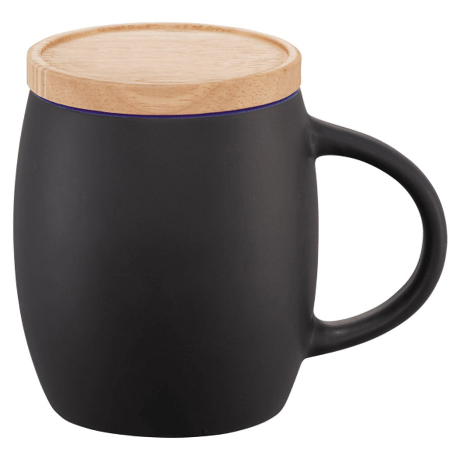 Leed's Black w/Blue Trim Hearth Ceramic Mug with Wood Lid/Coaster 15oz