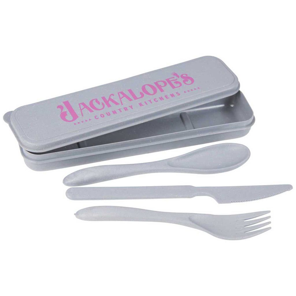Print a logo of your company on the Leed's Grey Bamboo Fiber Cutlery Set - let the bamboo case show off your brand! This set includes a bamboo fork, spoon and knife in a convenient carrying case - perfect for eating meals on the go. Customize the set and it'll be good to go as a giveaway for your trade shows and recruiting events or as a personalized gift for your long-time clients and employees.The minimum order for this product is 100 pieces.