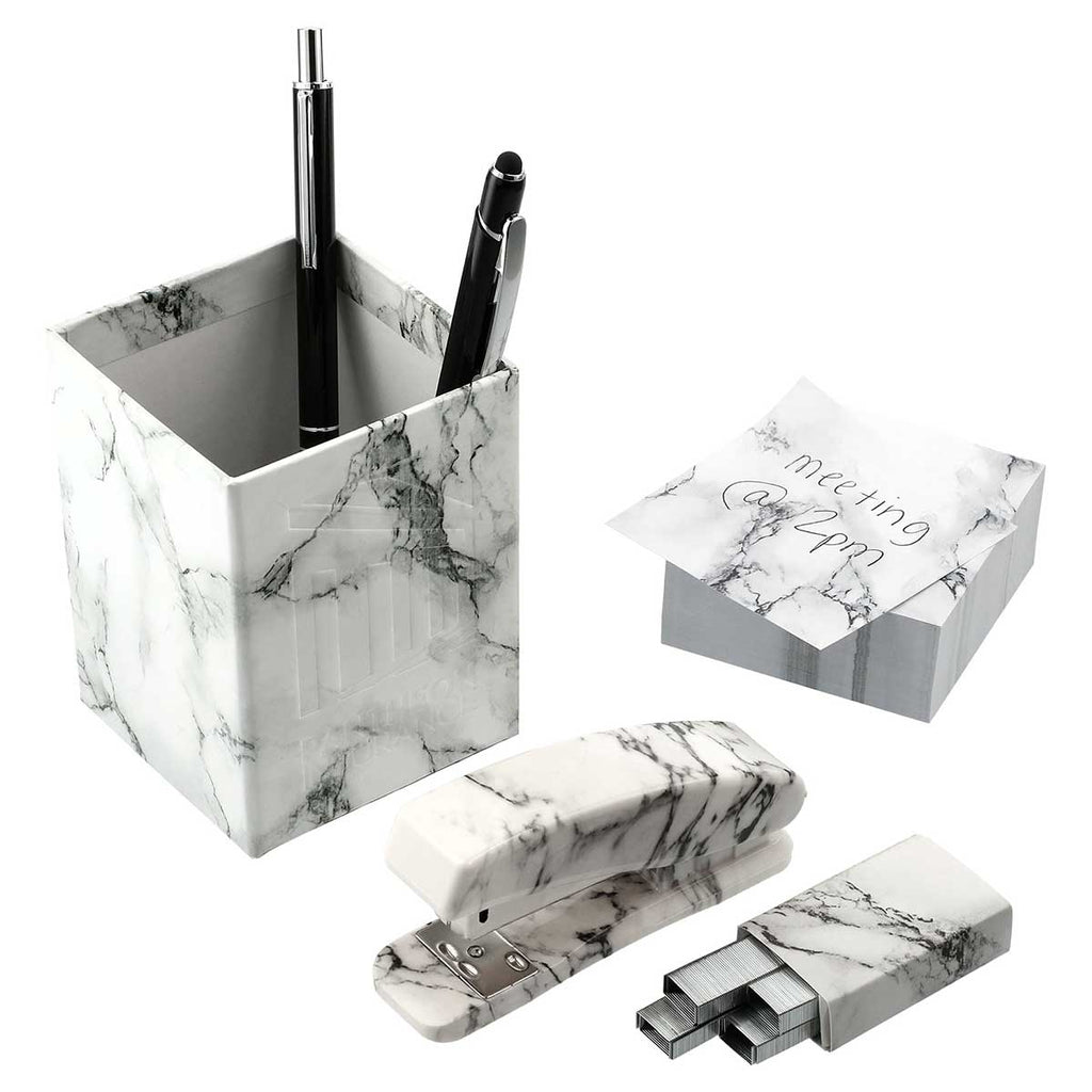 - Set includes pen cup, stapler, staple refills, hole punch, and note pad