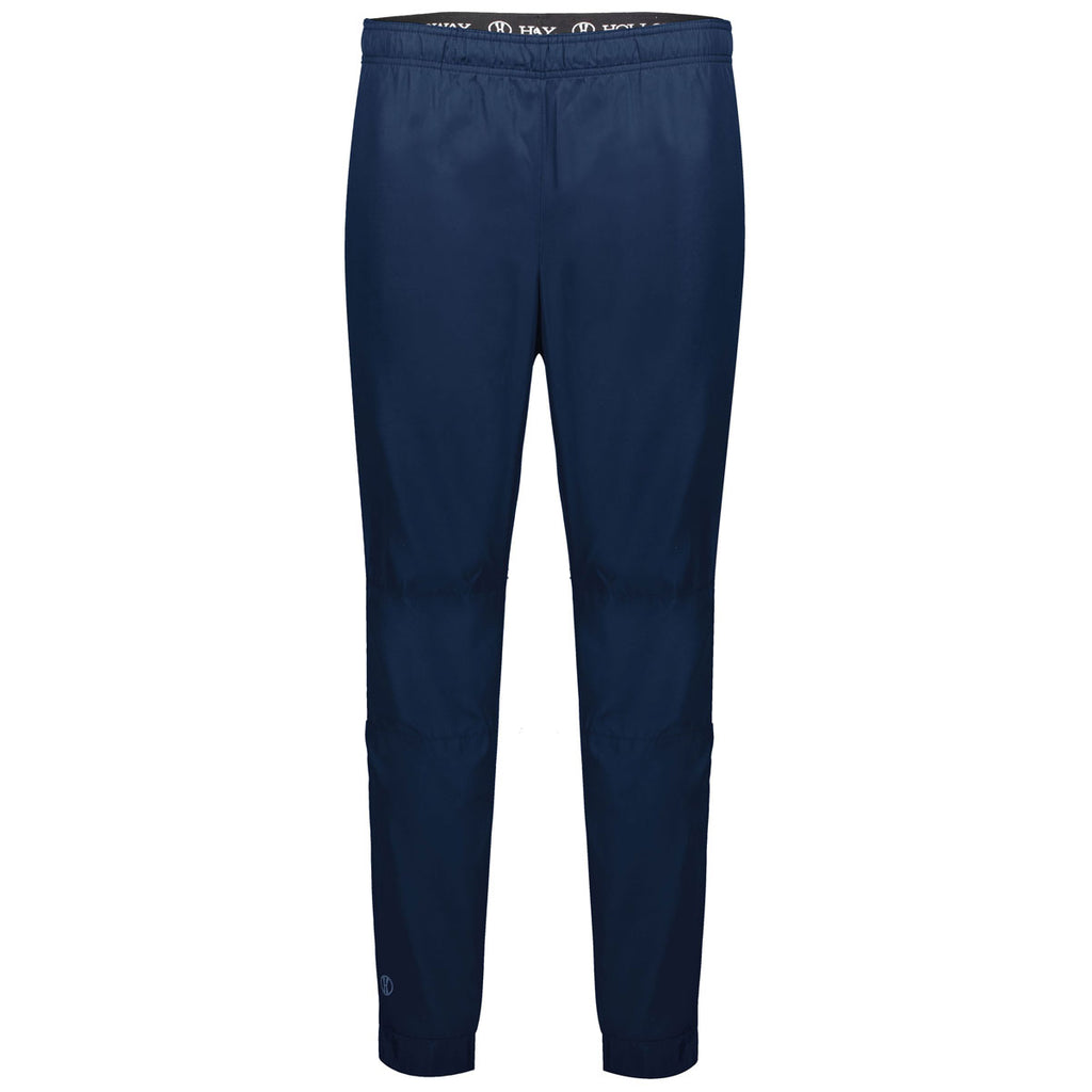 Custom embroidery will look outstanding on the Holloway Men's Navy SeriesX Pant. These pull on pants with elastic waistband with inner drawcord are the ideal combination of comfort and style. Try a company logo to use these as part of employee uniforms in certain types of business or add a custom logo to use as a product to promote your gym, team, workout brand, or anything you want. The 100% polyester pants with micromesh lining are lightweight, wind, and water resistant with a subtle textured pattern. Side seam pockets and a back welt pocket paired with a tapered leg with zipper on the outside lower leg make these great as warm-up gear and much more. Place an order today.Highlights