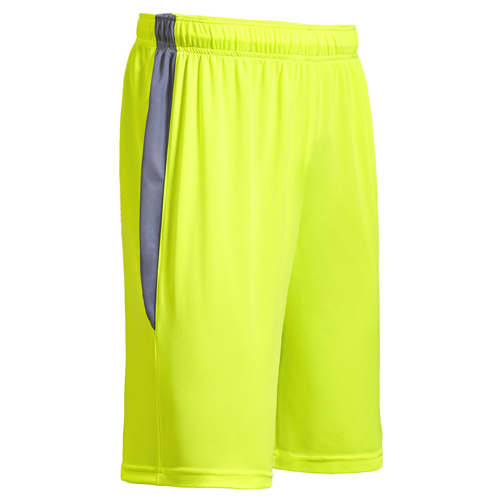 Tackle your workout regimen in Expert Men's Safety Yellow/Steel Outdoor Short that won't hinder your movement even during intense training activities. Sweat wicking shorts boast inseam with insert A-line side panel while an elastic waistband with adjustable draw cord ensures a custom fit. Contrast side panels make for a stylish touch. Anti-bacterial treatment keeps the garment fresher for longer. Active wear is among those few items that attract a broad audience, and these men's shorts being one of those items are customizable with logo imprint of your brand or company. It's perfect for corporate giveaways, dance studios, promotional merchandise.