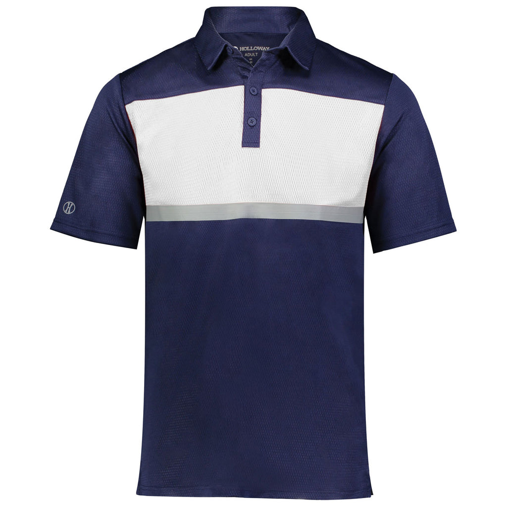Holloway Men's Navy/White Prism Bold Polo with embroidery is a must have for those who want to get noticed. The lightweight polyester wicking honeycomb knit has a bold look with a solid base and large block print on the chest in a complementary color. Created for the outdoors, this short sleeve polo has a UPF of 50+ and side vents to keep you cooler and provide fit. Add a company logo to use as employee apparel or something custom to use while enjoying a round of golf with friends. The three-button placket and self-fabric collar bring together this look that can go from the boardroom to the bar with ease. Place an order today.Corresponding Women's Style:Holloway Women's Navy/White Prism Bold Polo
