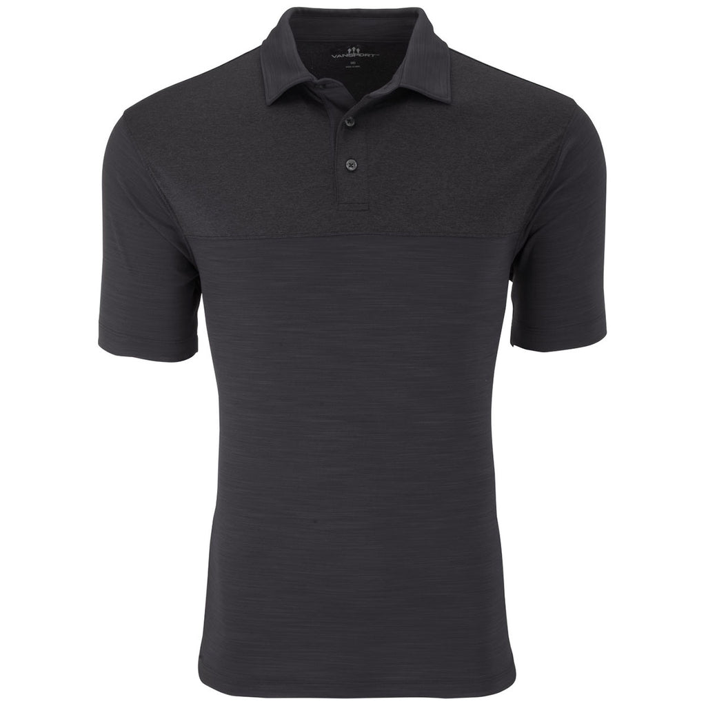 A great custom polo is a must have and the Vansport Men's Black Pro Horizon Polo will not disappoint. The mix of tonal textures offer visual interest to this sporty polo that is made to perform. Whether you need a custom look to play in a golf tournament or something that can serve as corporate apparel when worn with a sport coat. Add a company logo to use this as employee apparel with moisture wicking and UV properties that keeps everyone looking their best as they work their hardest.
