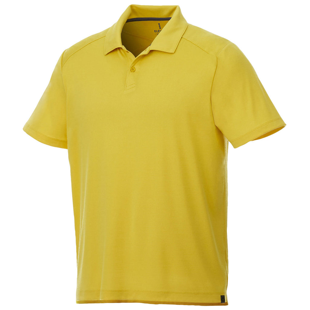 Think outside the box with a custom eco-friendly Elevate Men's Gold Amos Eco Short Sleeve Polo. This classically styled short sleeve polo has some earth friendly secrets with the 100% recycled polyester and a one of a kind look. Add a custom logo to the polo with asymmetric seaming details and side slits for ventilation to use as a custom gift. Try a company logo to use as employee apparel that is wash and wear, anti-pill, snag resistant, offers UPF protection, has moisture wicking, and feels like soft cotton. Who could ask for more from a simple polo?Corresponding Women's Style:Elevate Women's Gold Amos Eco Short Sleeve Polo