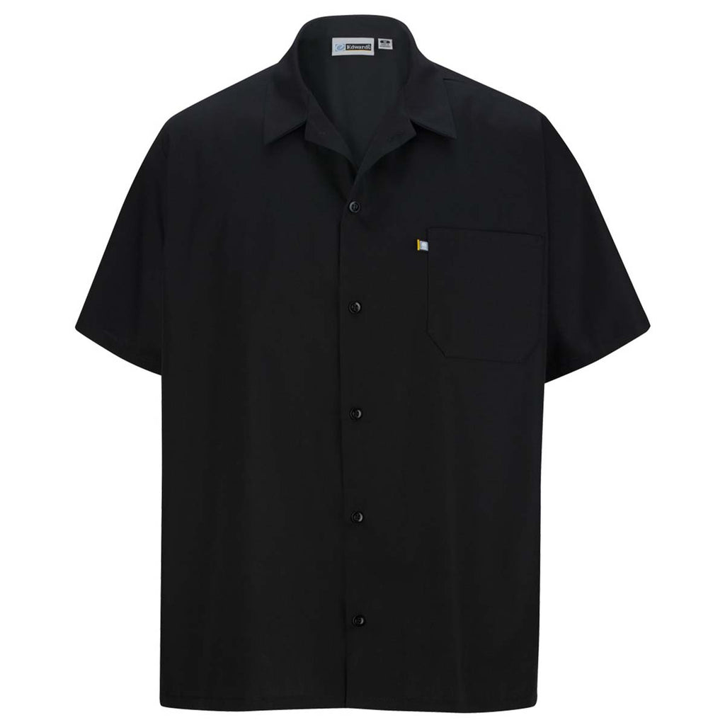 Your staff will look amazing in a custom embroidered Edwards Men's Black Button Front Shirt in bold black or crisp white. Add your company logo or corporate embroidery to these button front chef shirts for a professional look that is easy to wear and care for. Made of breathable polyester and cotton fabric this traditional look offers a chef collar and six button placket for layering. Short sleeves and a left chest pocket mean even in the hottest environments, your staff will keep cool. Excellent as corporate uniforms or for your foodie friends.