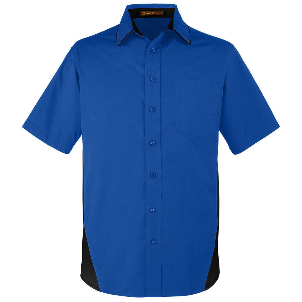 Enjoy a company logo on the Harriton Men's True Royal/Black Tall Flash Colorblock Short Sleeve Shirt to create employee apparel that can be worn as is or dressed up as corporate apparel as well. The short sleeve button up shirt is made of a cotton polyester twill blend with wrinkle resistance and stain release for day to day wear. Contrast details in all the right places create a unique look in this shirt that is available in tall sizes to find a proper fit for all. Ideal as employee gifts with a custom logo or to share with family and friends this shirt works well for many wardrobes.Highlights
