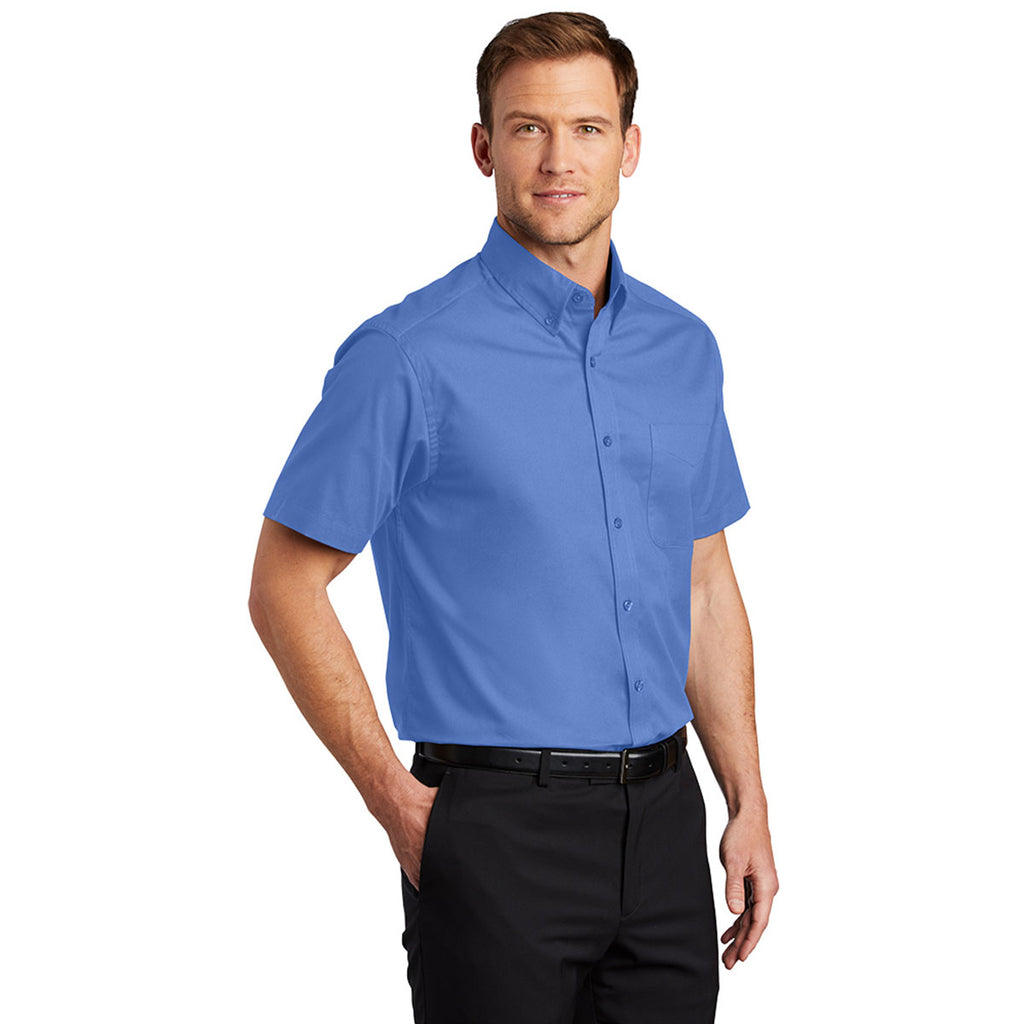 A short-sleeve button-down made for the workday but professional enough for upscale events? No, you're not dreaming: that's actually an apt description for Port Authority Men's Ultramarine Blue Short Sleeve Easy Care Shirt. The 4.5-ounce, 55/45 cotton/poly blend fabric is perfect for breathing, while the button-down collar ensures that your employees will always be event-appropriate. The patch pocket scores points for function as well as dressiness, and the dyed-to-match buttons are as subtle as they are necessary. And if you ask us, a good work shirt should be understated, allowing your own corporate embroidery and custom business logo to earn the attention.Highlights
