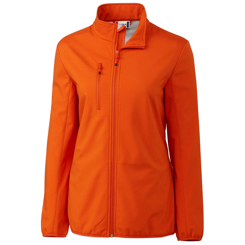 A touch of spandex makes the company logoed Clique Women's Blood Orange Trail Softshell perfect for professionals that spend plenty of time outdoors working and playing. Enjoy enhanced mobility, as you cut down tree limbs for a home improvement project or set up a tent for a weekend camping trip. The highly breathable softshell jacket quickly removes moisture to deliver supreme all day comfort. Add a custom logo on the large embroidery area for setting the marketing tone at the next sales conference. The mostly polyester fabric resists rips and tears to give you a softshell jacket that lasts for years to come.
