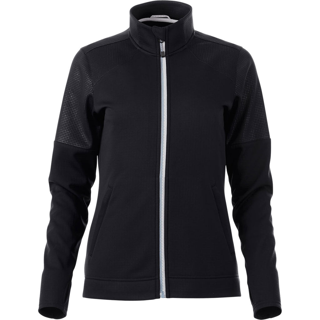 Elevate Women's Black Senger Knit Jacket offers the perfect combination of fashion and functionality. Offered in popular colors, this 100% polyester interlock knit jacket will keep you protected against the cold weather whether you are headed to the park or the office. An interior flap with chin guard, earbud cord guide and exit, graphic detailing on the shoulder, and sleeve cuffs with thumb exit are just the extras to make this jacket the best. Add a custom logo or corporate embroidery to give as corporate gifts or to function as employee apparel. Order enough for each of your employees and top clients to show your appreciation!Corresponding Men's Style: Elevate Men's Black Senger Knit Jacket