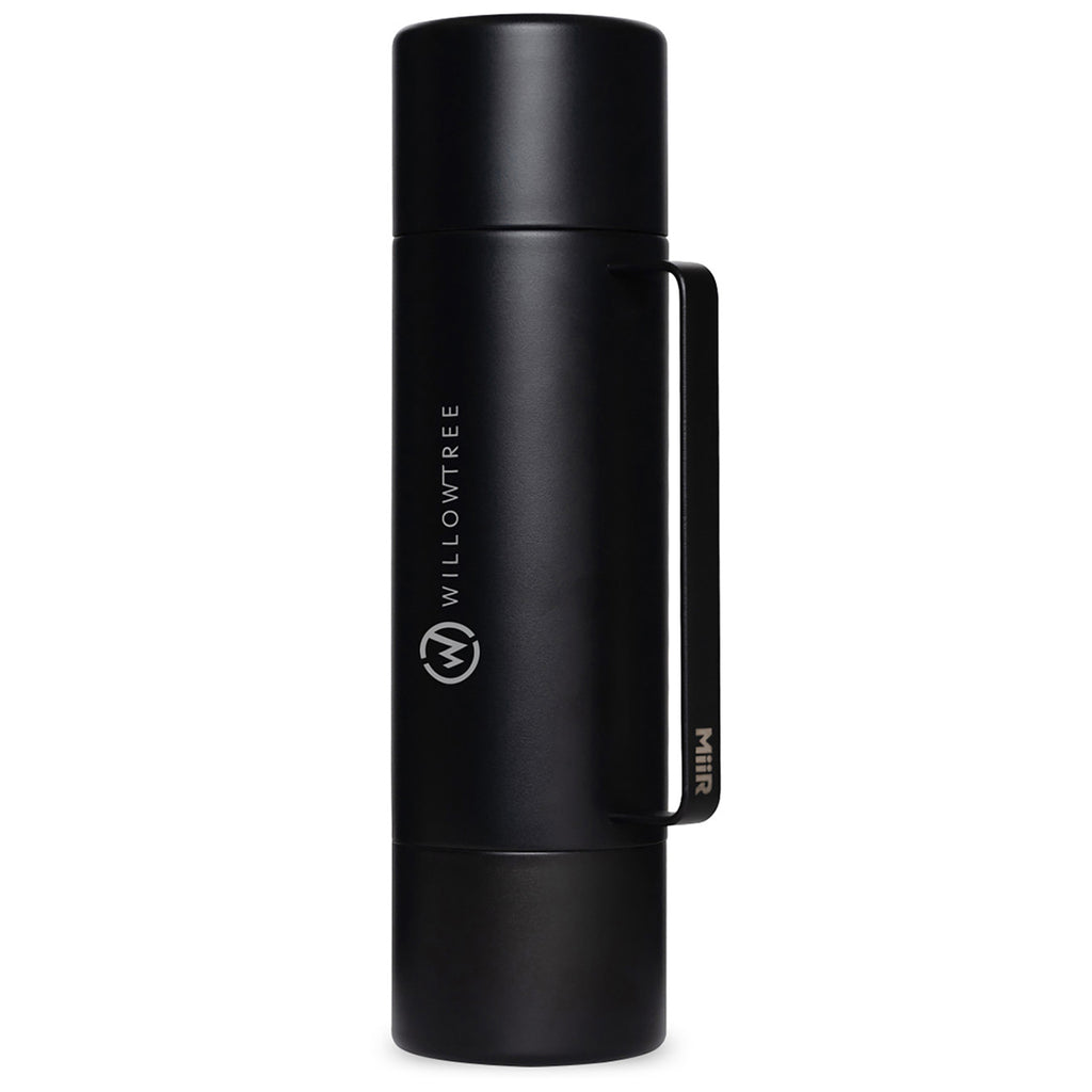 The MiiR Black Powder Tomo - 33 Oz. has a sleek, minimalist design that will elegantly showcase your company's custom logo or design. This double-wall vacuum insulated vessel will keep any liquid stored inside hot or cold for up to hours. It also includes a convenient carry handle and two sipping mugs.