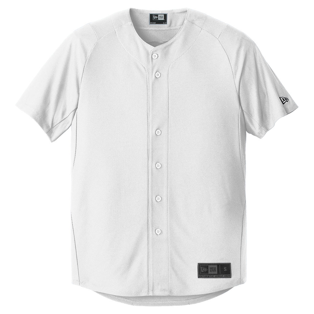 The embroidered New Era Men's White Diamond Era Full-Button Jersey is a man's best corporate apparel friend when it comes time for company sports season. Crafted from the same polyester diamond fabric that New Era uses to create its renowned line of caps, the sleek jersey includes raglan sleeves to increase arm movement flexibility. Engraved New Era dyed-to-match buttons act as magnets for everyone you pass on the way to the big game. With attention riveted on your chic full-button jersey, display the corporate logo you added on the large imprint area. With a custom logo, you connect with more customer prospects.
