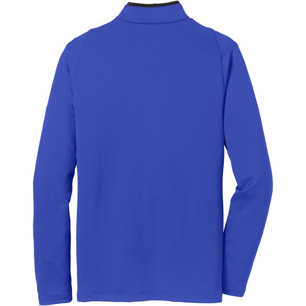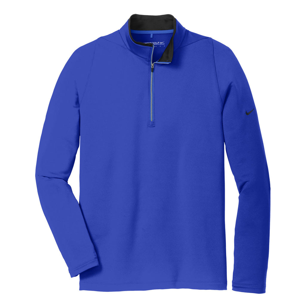 Say hello to your new favorite clothing item: the Nike Men's Royal/Black Dri-FIT Stretch 1/2-Zip. Just as comfortable on the golf course as it is in the office, this is a corporate Nike style that is clean, modern, and purposely built for your custom logo. So why does it have "stretch" in the title? It is made of a 93/7 polyester/spandex Dri-FIT fabric with just the perfect amount of stretch for movement at the driving range or in the conference room. The Dri-FIT moisture-wicking technology will keep you cool and dry, and the contrast collar and zipper, open cuffs and open hem will keep you looking great. With the trademark Swoosh on the sleeve, that means you've got a wide open left chest for your company logo. Like we said: your new favorite clothing item.
