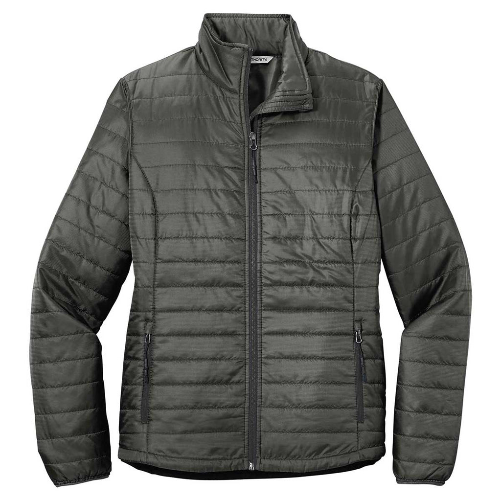 Stay warm in cold weather with a custom logo Port Authority Women's Sterling Grey/ Graphite Packable Puffy Jacket. The ideal choice for enjoying the outdoors when the weather turns, this 100% polyester shell with polyfill insulation has an interior storm flap, elastic binding at the cuffs, and adjustable drawcord at the hem for the perfect fit. Add a corporate logo to use at trade shows, recruiting events, or even as employee gifts for any occasion. Zippered front pockets and a port pocket allow for embroidery as well as storage of items that are needed throughout the day.Corresponding Men's Style:Port Authority Men's Sterling Grey/ Graphite Packable Puffy Jacket