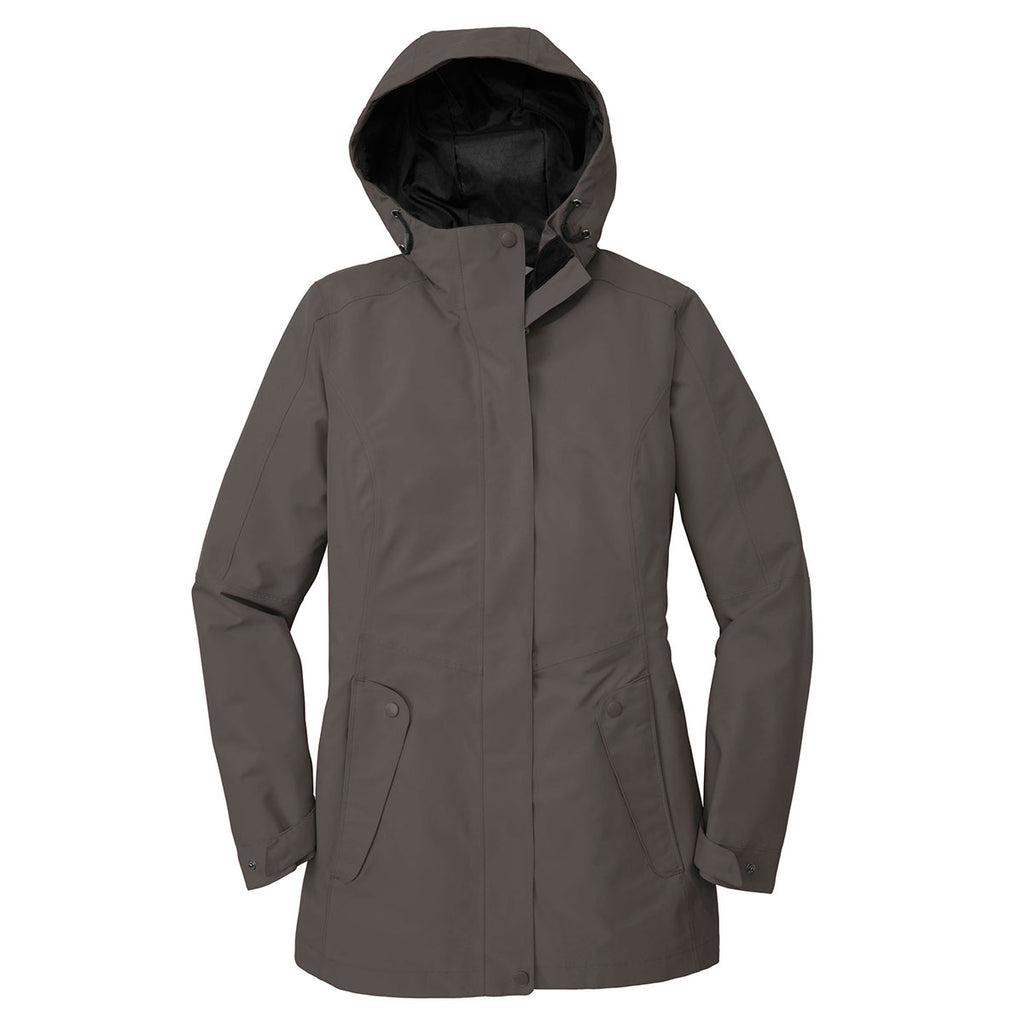 Put smiles on the faces of company employees by giving away the multi-purpose Port Authority Women's Graphite Collective Outer Shell Jacket. The waterproof outer layer prevents rain from putting a damper on weekend camping trips, or even the trip from the car to the office. Polyester printed lining acts as an additional layer that traps body heat. Attach the adjustable hood and enjoy full body protection against the worst weather delivered by Mother Nature. Achieve the perfect fit for the hood by locking the draw cord. Add a custom logo on the large imprint area to stir more interest in your products.Corresponding Men's Style: Port Authority Men's Graphite Collective Outer Shell Jacket