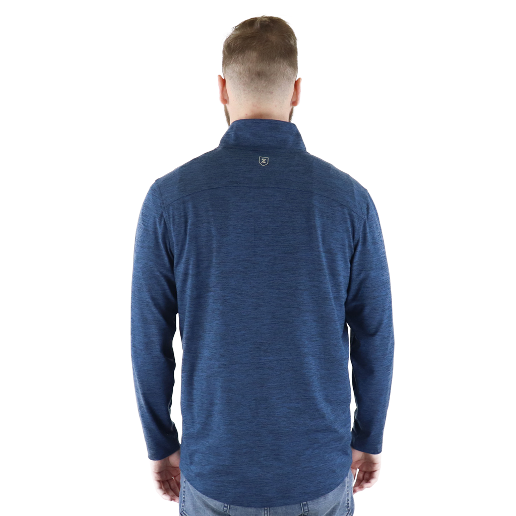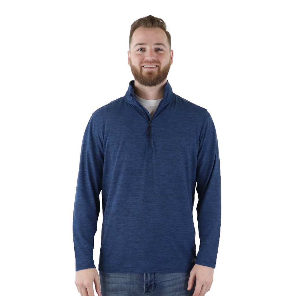 The logo-branded Zusa Brisk Quarter Zip is a versatile layering piece that was made for a wide range of activities. Whether you're looking for a comfortable addition to your casual work wardrobe, or you need a new layer that will accompany you on your next fitness routine, the navy heather Brisk Quarter Zip will do the job. With your custom logo on the chest, sleeve or back, you will rep your brand effortlessly in and out of the office. This custom sustainable style is moisture wicking and made of a polyester-spandex blend to give you breathable comfort all day long.