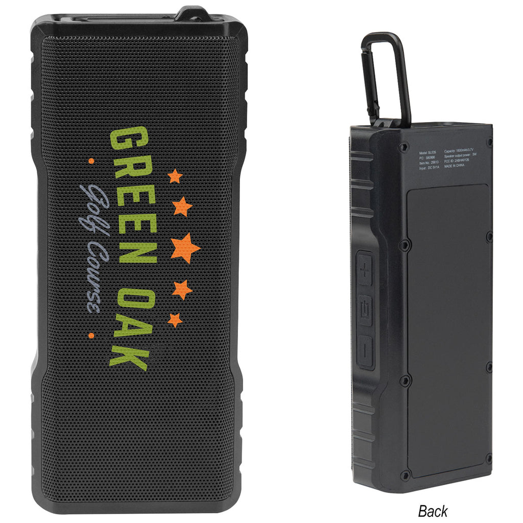 Choose a custom design for the Hit Black Magnetic Speaker With Carabiner for those who enjoy outdoor adventures. This speaker has a magnet on the backside to connect it to a golf cart, ATV, or any other magnetic surface to keep the party going no matter what happens next. Up to five hours of playtime with a full charge.