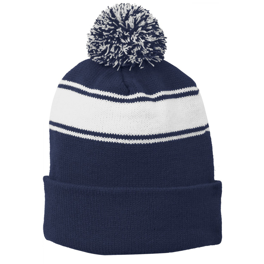 Sport-Tek Stripe True Navy/White Pom Pom Beanie