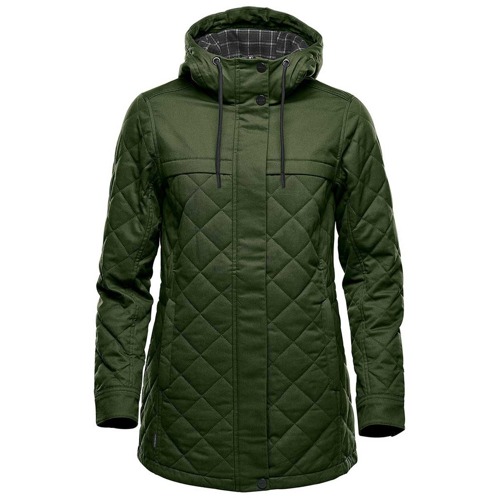 Add a company logo to the Stormtech Women's Earth Green Bushwick Quilted Jacket to create a look everyone will love. The gorgeous poly fill jacket will keep you warm and protected when the weather is unpredictable. The snap front closure has an adjustable waist for a more form fitted look when desired. When the wind picks up, use the attached hood with adjustable cord to stay warm. Perfect as a corporate gift or general cold weather wear. This is workwear that everyone will want.Highlights